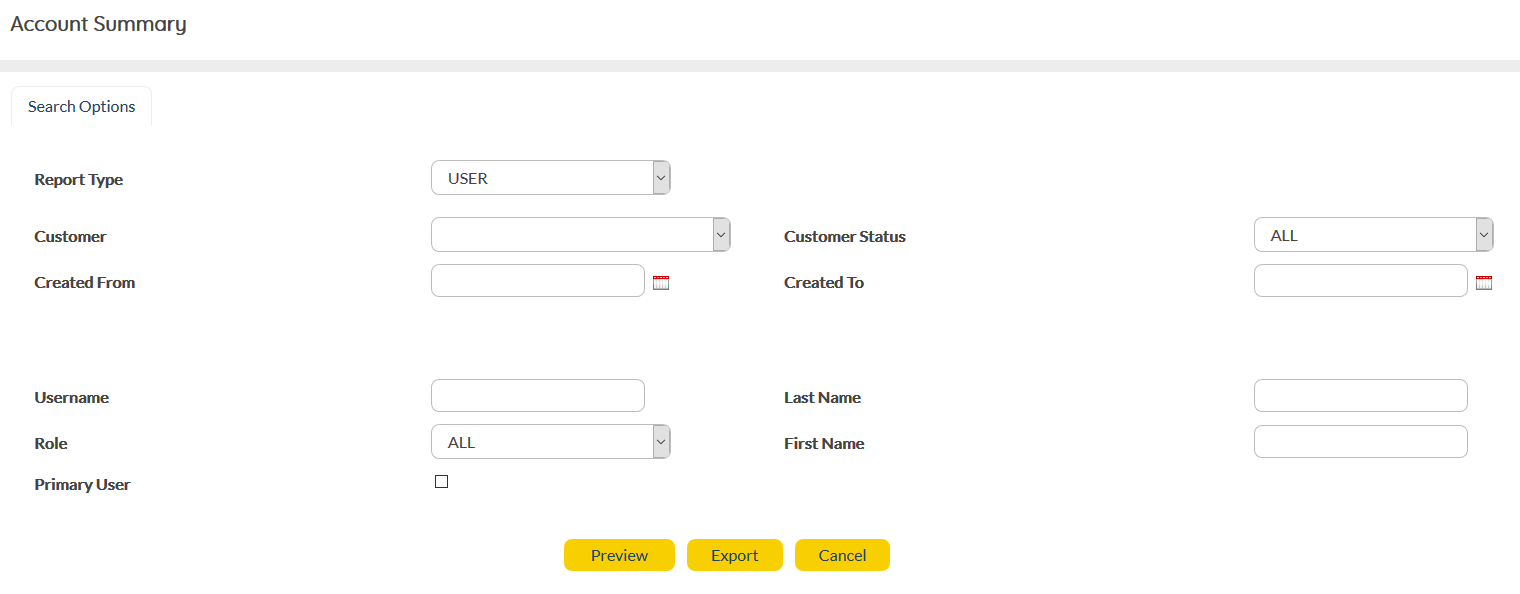 Type of report to be previewed / exported. Options available are ADDRESS, LICENSE OR USER.