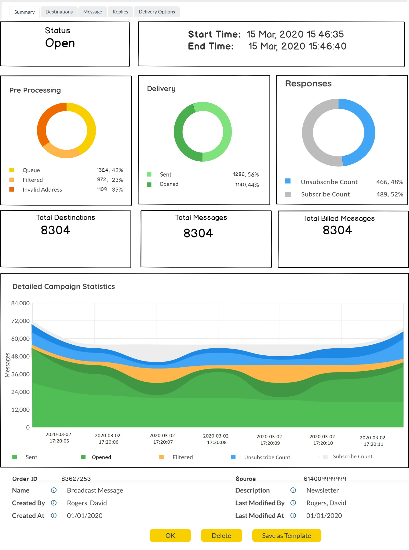 All messages that you save, schedule, or send are displayed in this table. Click an order name to view its details or one of the following icons: