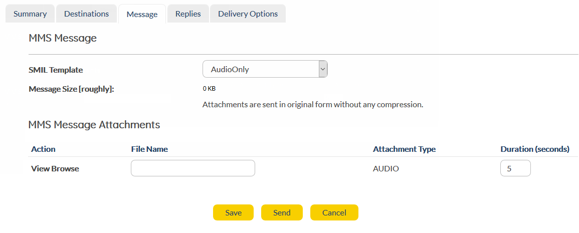 Once you have confirmed your attachment, click 'Upload'. The attachment name will be displayed in the 'MMS Message Attachments' field.