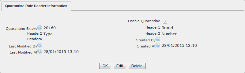 Brand, Type, Number and (blank): These are the parameters as defined in your Rule Header screen - they will be named in accordance with the names selected by you. Enter your required keywords to trigger the quarantine in each parameter field. You may enter multiple keywords in a single field if they are separated by a comma.