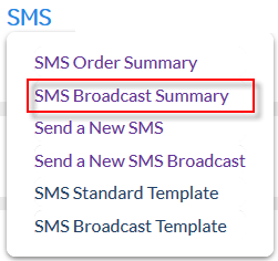 The 'SMS: Broadcast Order Summary' page is the central hub for viewing and editing 'Broadcast' SMS Orders (licenses required).