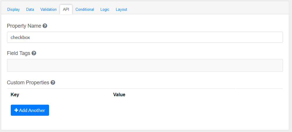 Users configure any custom properties for this component. Use Add Another button to add more than one key.
