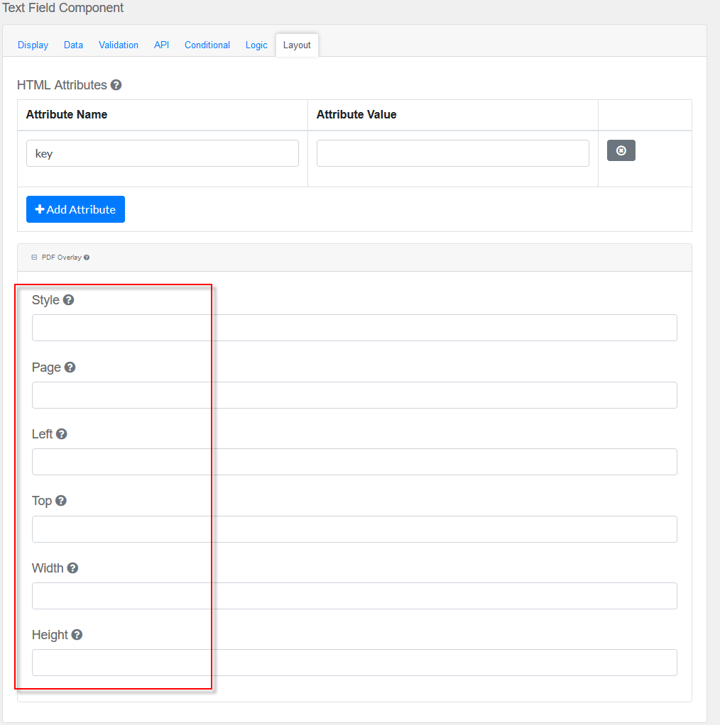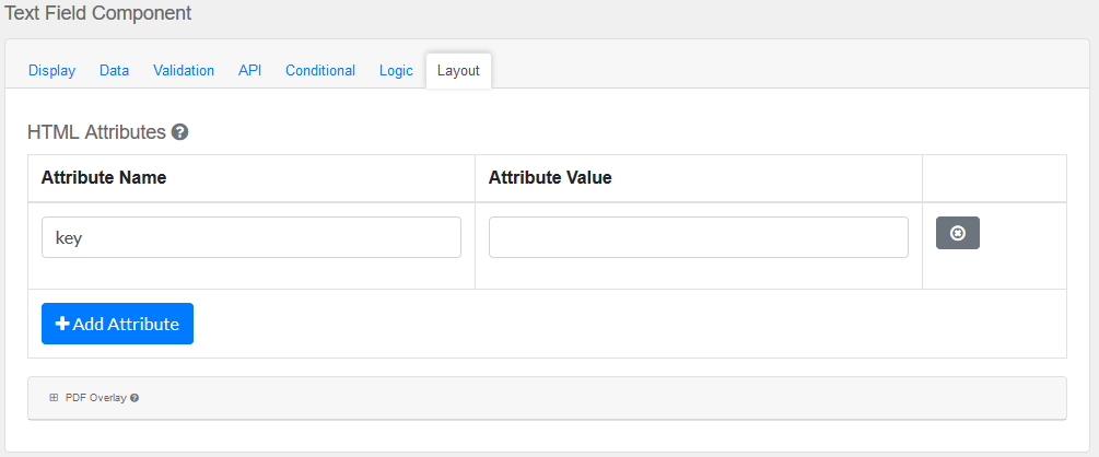 Note: Attributes provided by other component settings or other attributes generated by form.io take precedence over attributes in this grid.