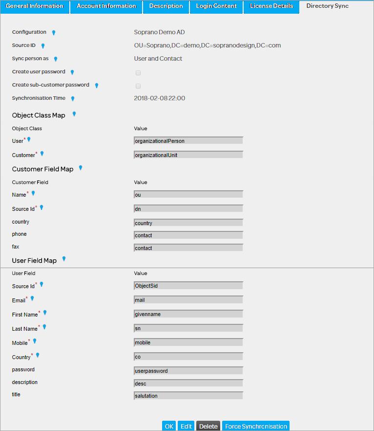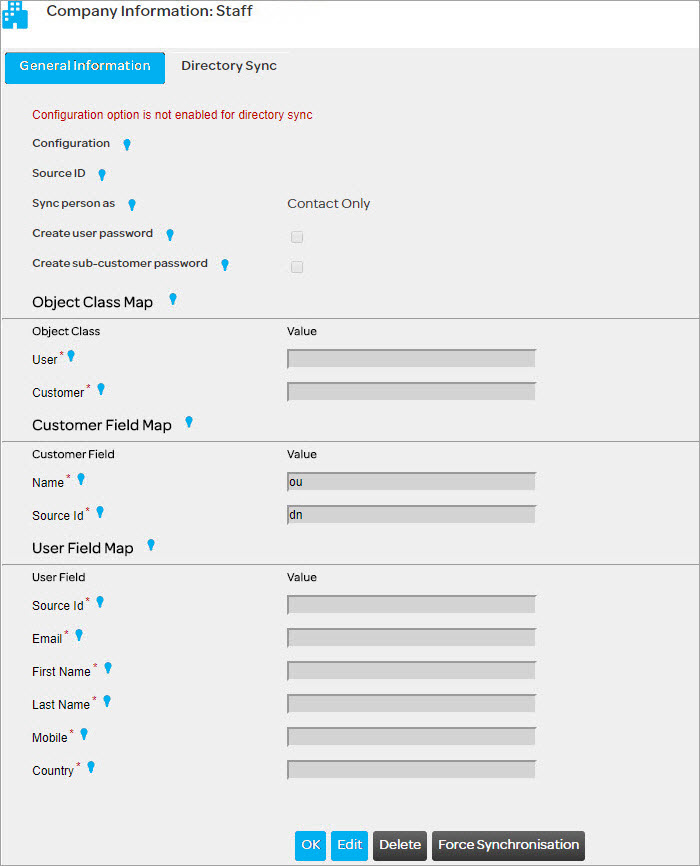 •Customer Synchronisation Source Id Attribute will always be ‘dn’ and is read-only. Customer Name Attribute will always be ‘ou’ and is read-only.