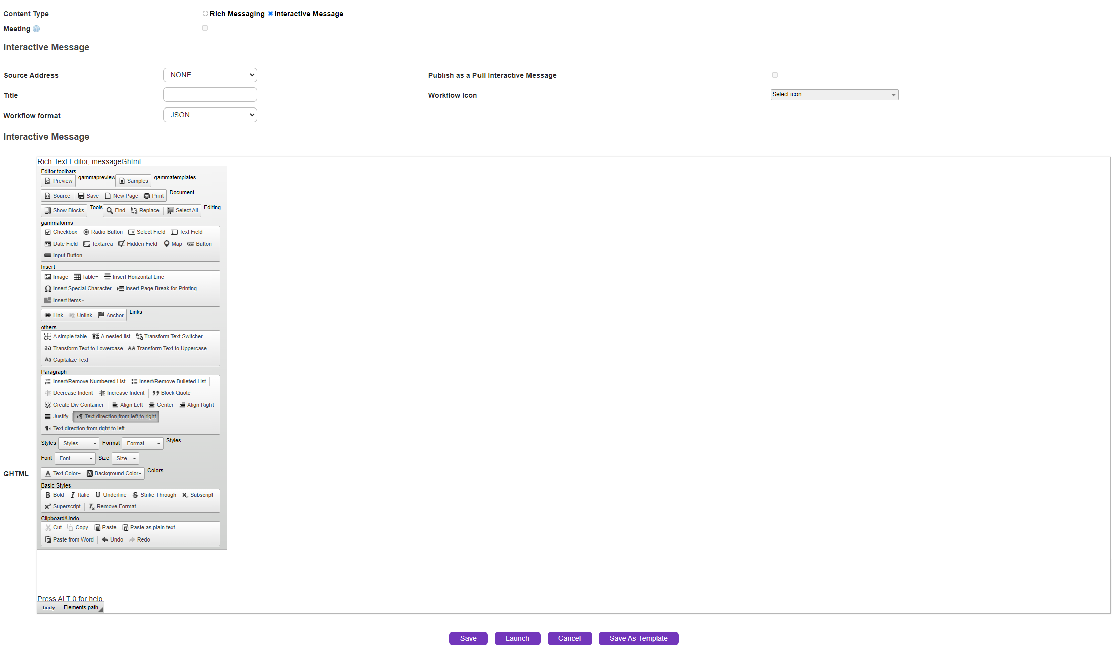 Allows user to choose the format for receiving responses - 'JSON' or 'Plain Text'. If the expected response may include an image, user must choose JSON as the workflow format. Once the user selects JSON, the attribute <gamma:format="application/json"> is added in the gamma header of the HTML source. You may verify this by clicking on 'Source' button in the HTML editor.