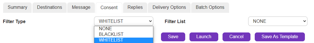 •WHITELIST - Messages will only be sent to those numbers that are contained in both your destinations and the chosen whitelist.