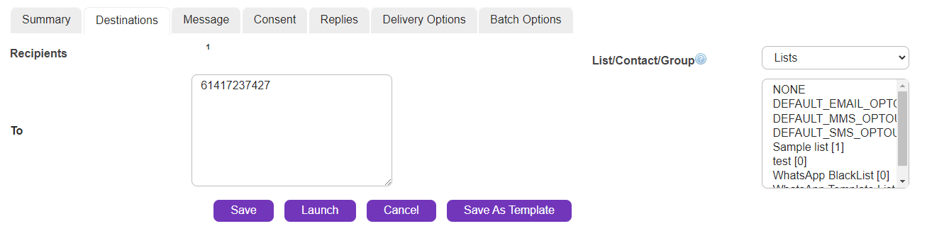 Choose pre-existing destination(s) for your message. Select 'Lists', 'Contacts' or 'Groups' from the drop-down list. Click here for information about lists, contacts and groups.