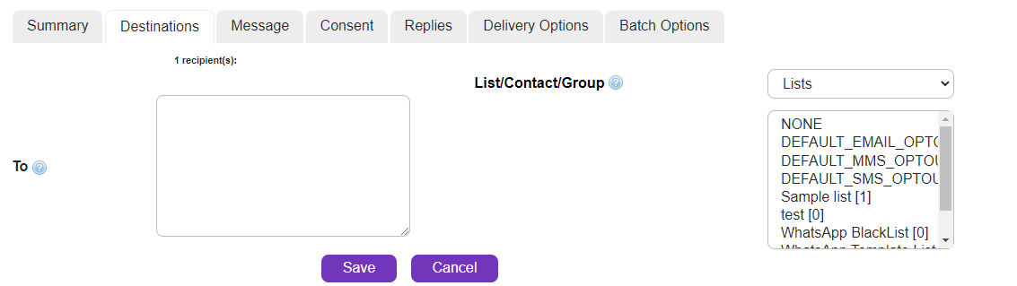 Choose pre-existing destination(s) for your message. Select 'Lists', 'Contacts' or 'Groups' from the drop-down list. Click here for information about lists, contacts and groups.
