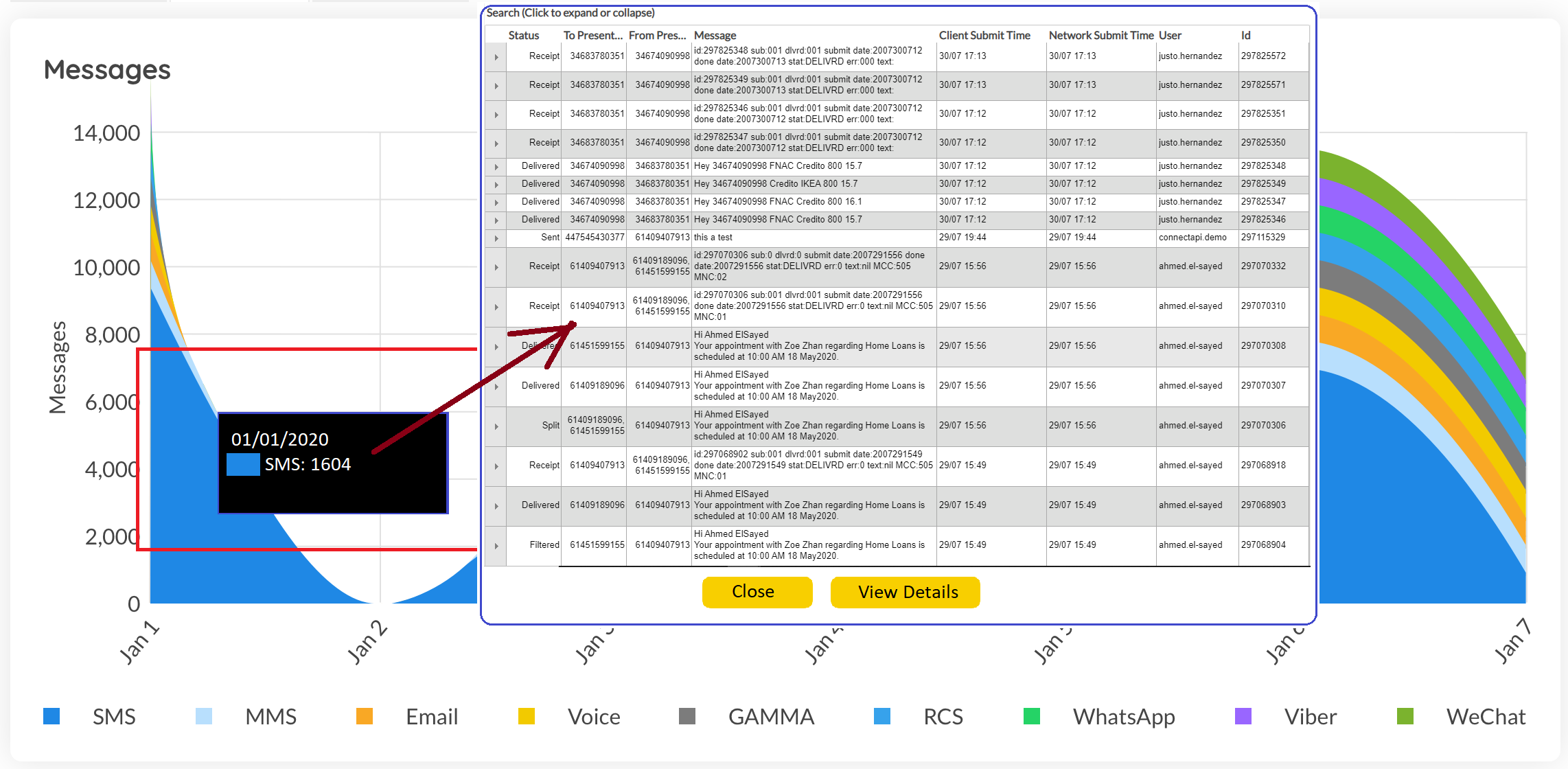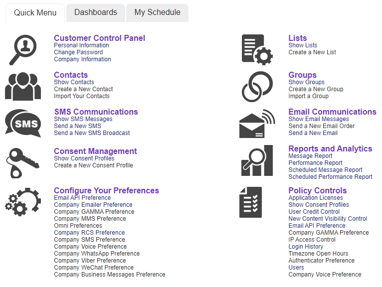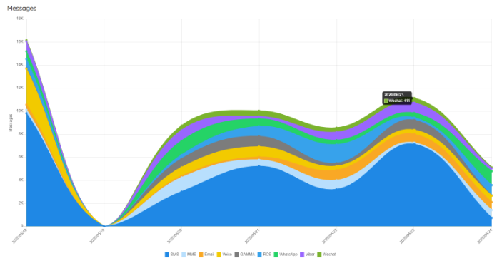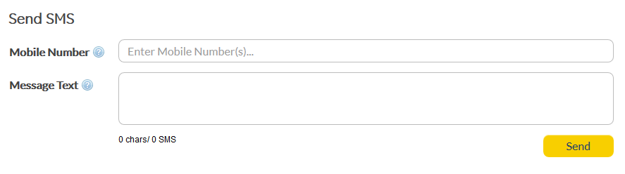 This section provides several sets of 'at-a-glance' reporting statistics relating to message traffic, as detailed below. Simple SMS messages can be also be sent from the 'Dashboards' screen.
