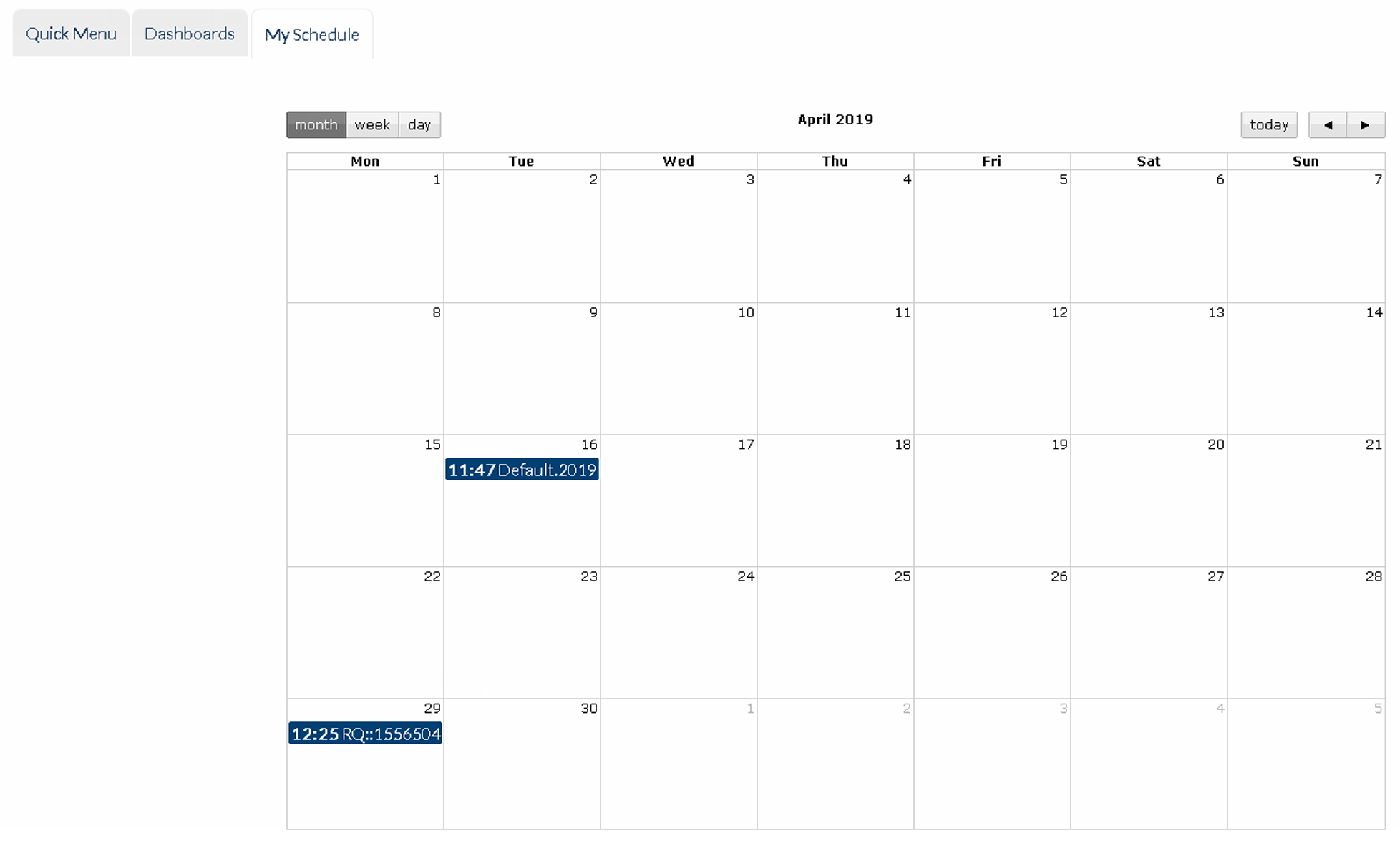 Calendar view of scheduled orders (e.g. SMS, Email - other types may be visible based on application licenses held). This excludes scheduled reports. Times/dates are displayed according to the user's personal settings. Click 'Month', 'Week' or 'Day' to change view as required.