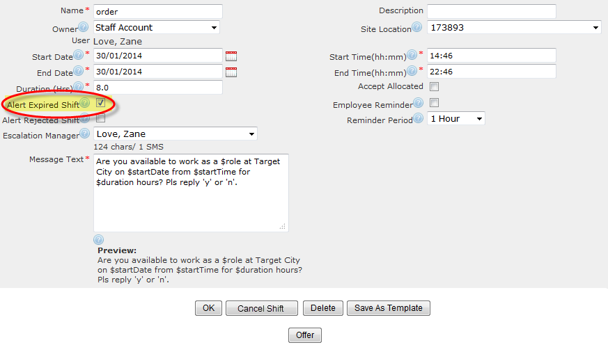 1.When you create a shift order, make sure the 'Alert Expired Shift' button is ticked.