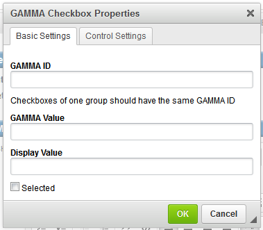 GAMMA ID is the ID given to the group of checkboxes to link them together as the options for one piece of information. GAMMA Value is the value returned in the response to you if the checkbox is selected when the form is submitted. Display Value is the checkbox label which will be displayed to the user. Selected indicates the checkbox will be pre-selected when presented to the user in the form.