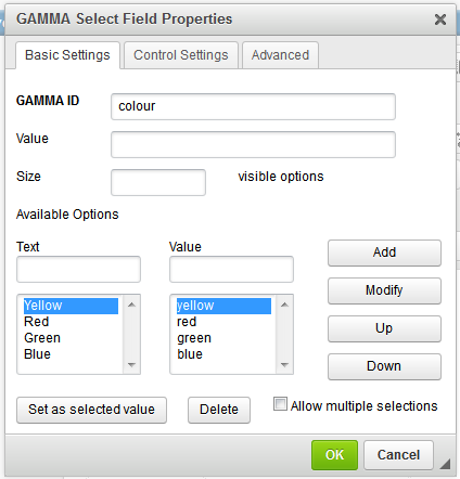 GAMMA ID is the name given to the field. In the Available Options, define the label to display to the user (Text) and the value to be sent back if it is selected (Value) and click Add to add them to the pre-defined list. Modify allows you to modify an option that has already been added - select the option, make your change then click Modify. Up and Down allow you to change the position of an option in the list. Set as Selected Value will make that option the default (pre-selected) option in the dropdown when it is presented to the user. If left blank, the first value in the list will be presented. Delete will remove the selected option Allow Multiple Selections allows you to toggle if the field will only allow a single response or multiple responses.