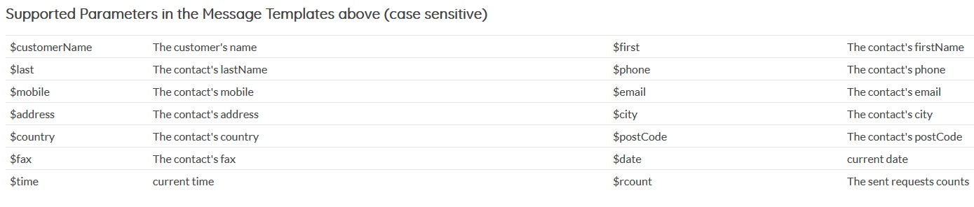 We support mail-merge parameters in the message template above. All these parameters are case sensitive :