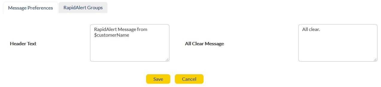 The Message Preferences enables you to set up your RapidAlert Header Text and All Clear messages. You would see the below screen with fields that are discussed below: