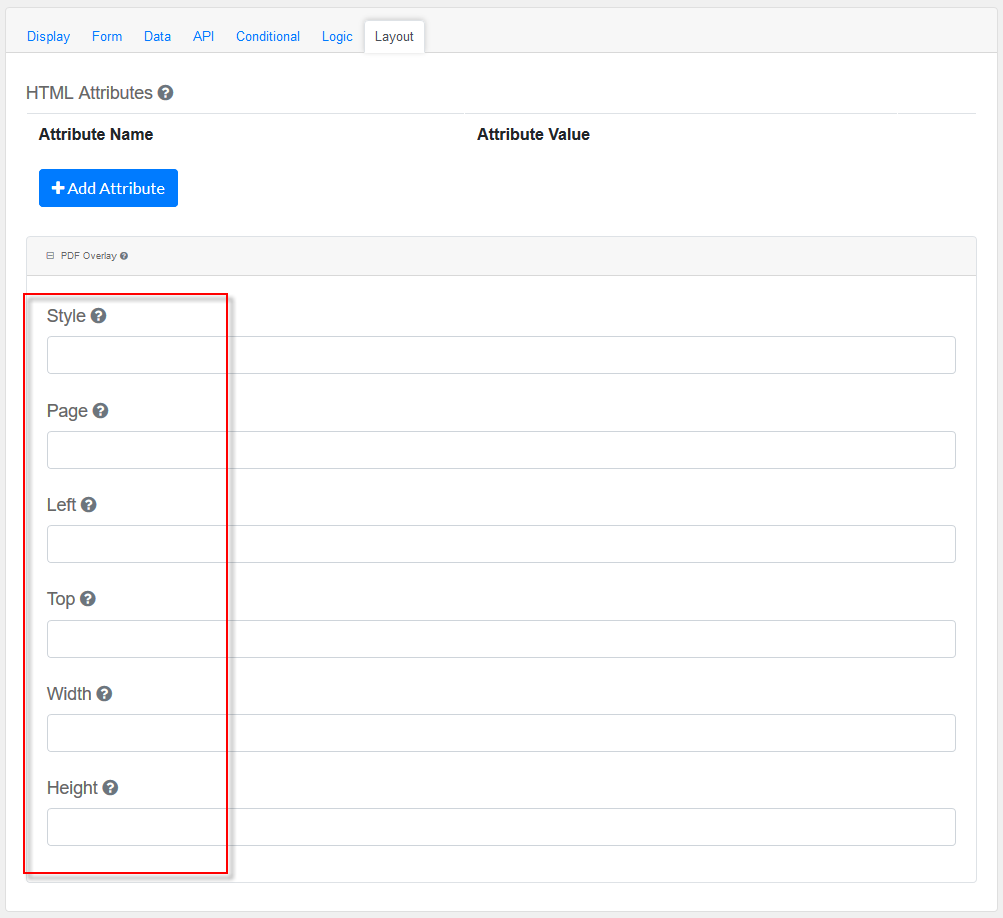 Note: Attributes provided by other component settings or other attributes generated by form.io take precedence over attributes in this grid.