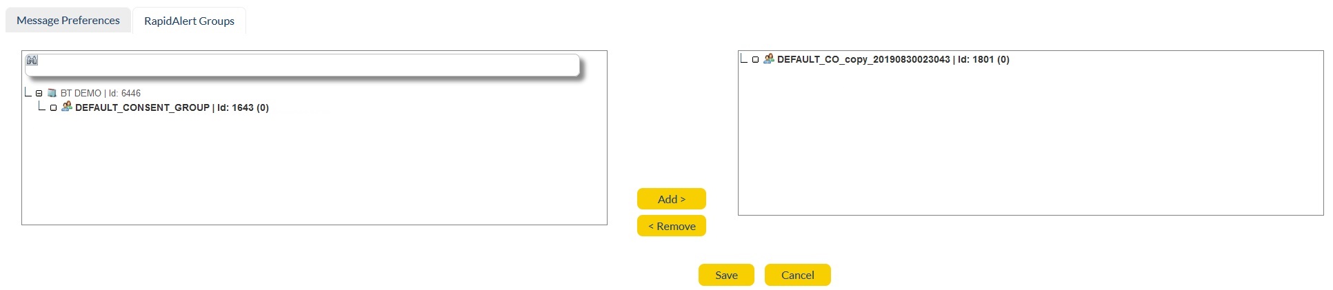 3. Add/Remove: Once the selection is done, click on Add button. Selected Group and all its branches will move to the right Group window. RapidAlert will retrieve a Group from this table when triggering an alert. Scroll down the panel and look for Group-Id to confirm you have selected the right Group. If you have added an incorrect Group, use Remove button to move it back to the left Group panel.