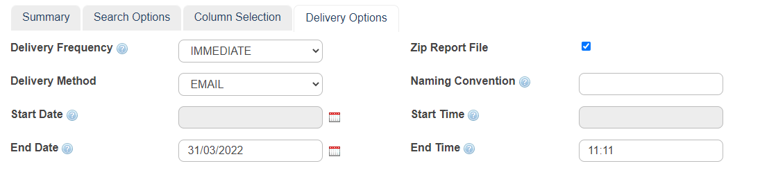 These fields will be made inactive if you choose 'DAILY' or 'MONTHLY' as the 'Delivery Frequency' in 'Delivery Options' tab - see next section for more details.