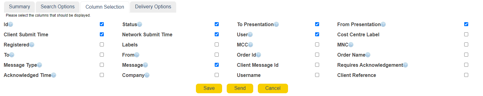 The "Column Selection" tab is available for users to choose individual columns that need to be visible in the viewed / exported reports. This gives the users flexibility to be able to view only specific use-case columns. Each time the Users would like to view reports a little different, they can use the "Column Selection" feature. |