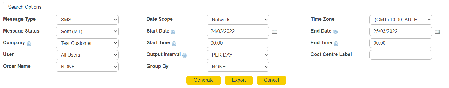 Maximum search timespan is one month (up to 31 days) within the recent 90 days period. Contents that are more than 90 days are automatically wiped from the system thereafter. AT&T GSMS will adjust the start/end date regardless of what is entered by the user. This can be modified at a portal level. Raise a help ticket via help@sopranodesign.com for more information. |