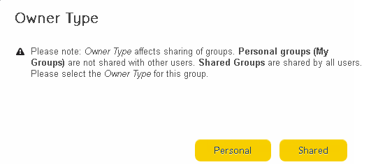 You will be prompted to choose whether the group is 'Personal' (belongs to the current user) or 'Shared' (group can be accessed by any users belonging to the parent customer).