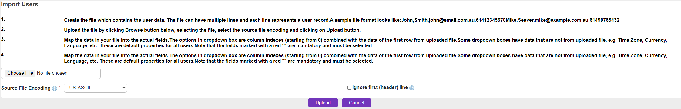 Some drop-down boxes have data that are not from uploaded file, e.g. Time Zone, Currency, Language, etc. These are default properties for all users.
