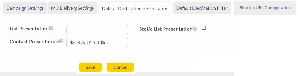 The values correspond to fields set up in the recipient's 'Contact Details'. For Example: If '$first' '%last' values are saved in the 'Contact Presentation' field, the receiving contact's first and last names will be displayed instead of a mobile number in any related reports.