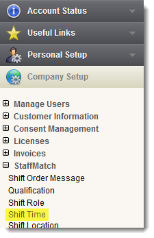 Click the 'Shift Time' link in 'Company Setup > StaffMatch' to open the 'Shift Time Summary' screen.