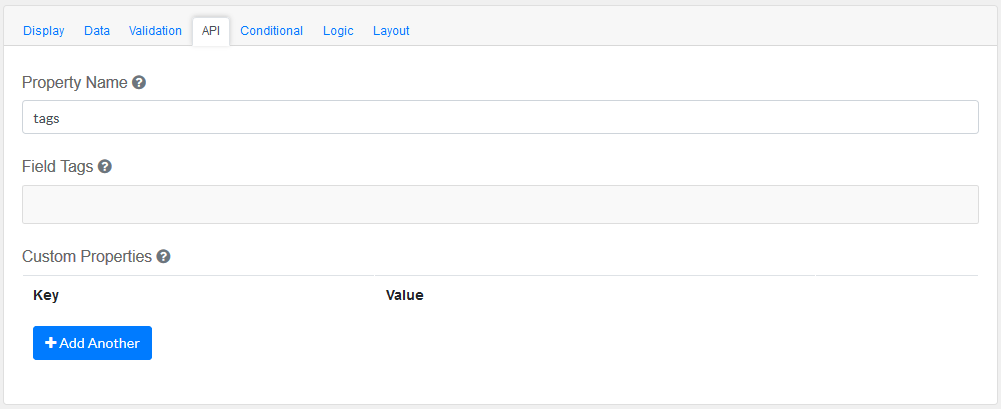 Users configure any custom properties for this component. Use Add Another button to add more than one key.