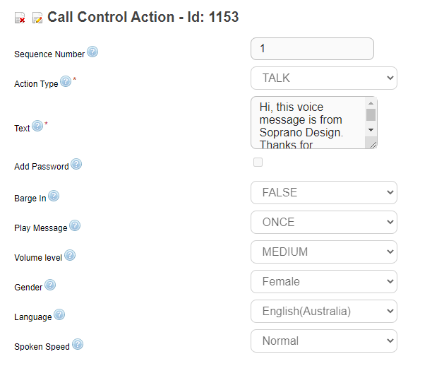 Once you have added the fields as explained above, hit Save icon on the Call Control Actions menu-bar. Call Control Action with Talk option gets saved: