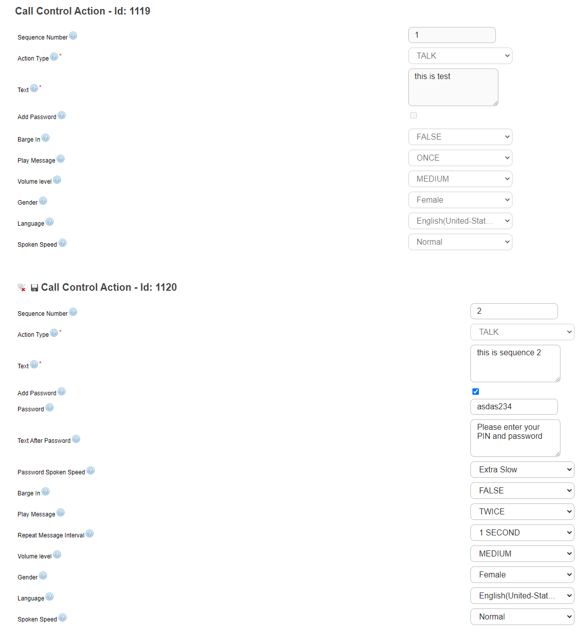 Notice the sequence number in each Call Control Action. When a voice call is triggered with a this object, the actions configured inside them will be executed in the sequence order.