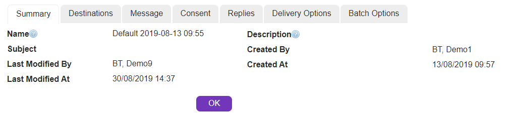 Modify the template under Destinations, Message, Consent, Replies, Delivery Options, Batch Options tabs depending on whether you wish to :