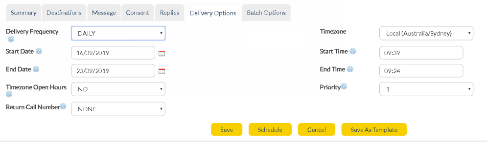 Specifies the times that messages can be delivered (useful if you don’t want to send messages out at night, after work hours etc.) Options include:
