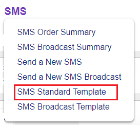 Click the 'SMS Standard Template' link in SMS tab drop-down menu (also accessible via 'Setup' menu on left-hand side).